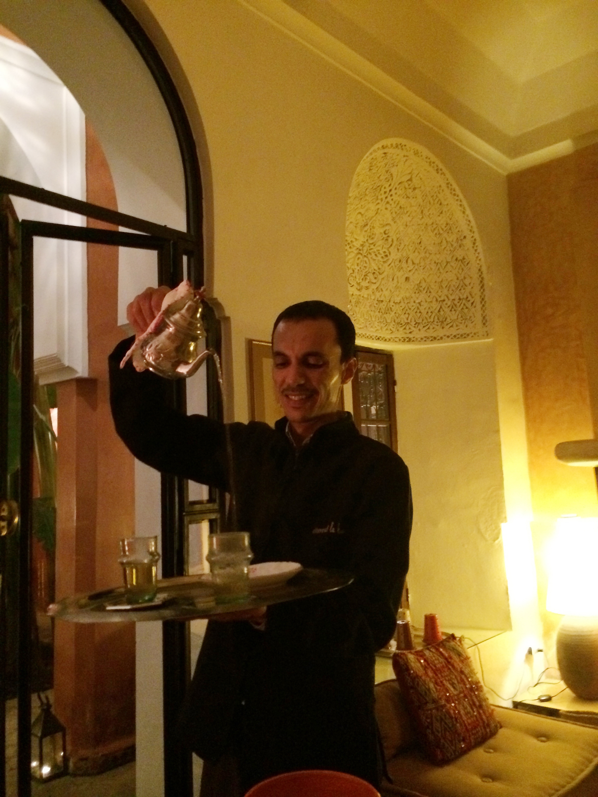 Rocco saves the best for last. He takes me into a little shop, Beldi, that you would not think anything of from the outside but inside the shop is about as big as my bedroom with exquisite caftans, moroccan style jackets with embroidery, jewelry and beautiful pashmina scarves. The owner, I (forget his name) is polished and elegant, with trendy glasses and quite gracious. I am offered my 75th cup of tea of the past 24 hours, and settle in. I try on many things but am seduced by a beautiful grey pashina jacket which of course I buy. It was entirely reasonable too.