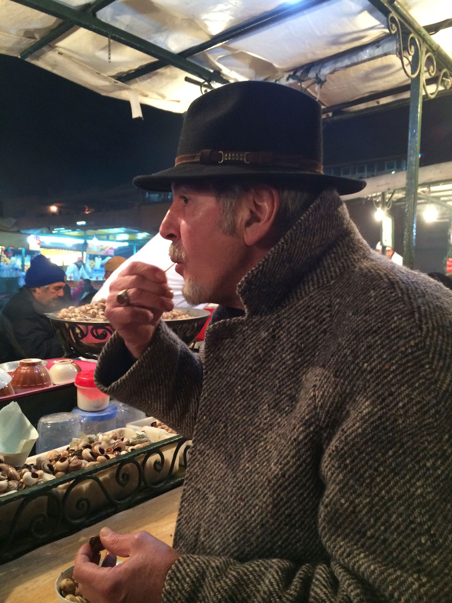 We are starving, so Rocco takes me to a part on the Jemma, where there is street food and these guys dip big slabs of beef that is suspended from a pole into a whole in the ground that has a fire that has been burning all day. The meat cooks slowly for hours and comes out, fatty, juicy delicious, they throw a chunk of it on a piece of paper with some hot bread. you eat it on some makeshift benches behind the whole in the ground with all the other Moroccans (not many tourists here). About 2 euro tops. Fantastic.